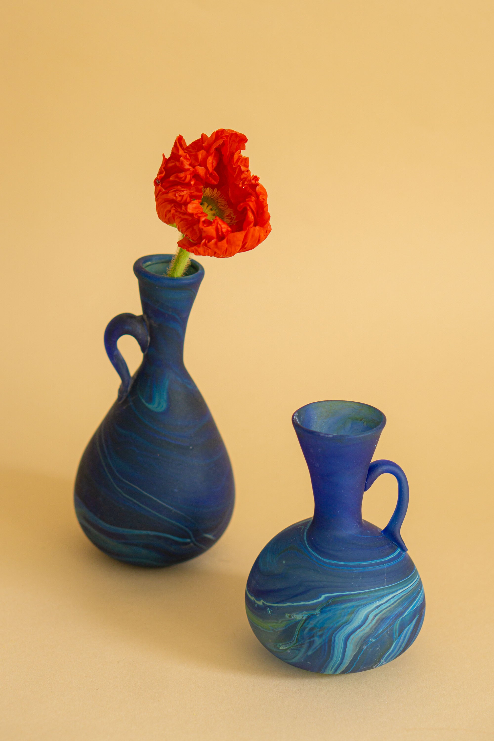 Alle vaserne har en diameter på ca. 9 cm. mens højden er forskellig. Den høje grønne er 19 cm., den høje blå er 18 cm. og den lavere runde blå og marmorerede kande er ca. 10 cm. høje